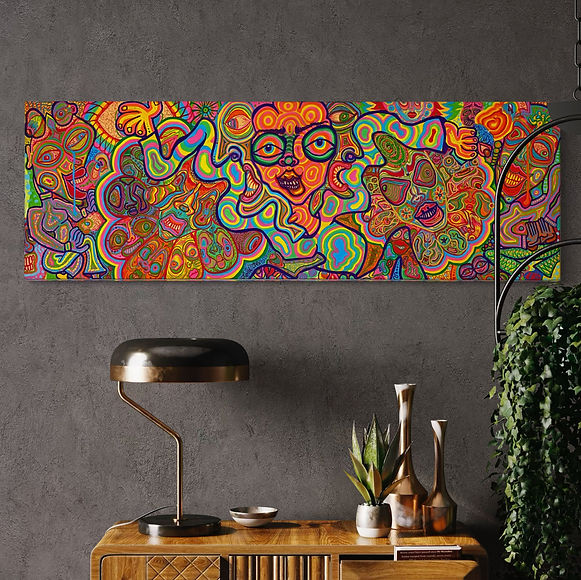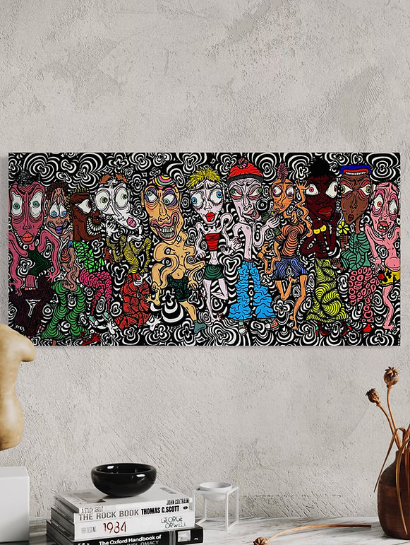 Leurs sourires démesurés masquent des yeux lourds, fatigués, presque douloureux. Dans cette foule bariolée, la comédie frôle la tragédie : un théâtre de l’humanité serrée contre elle-même.